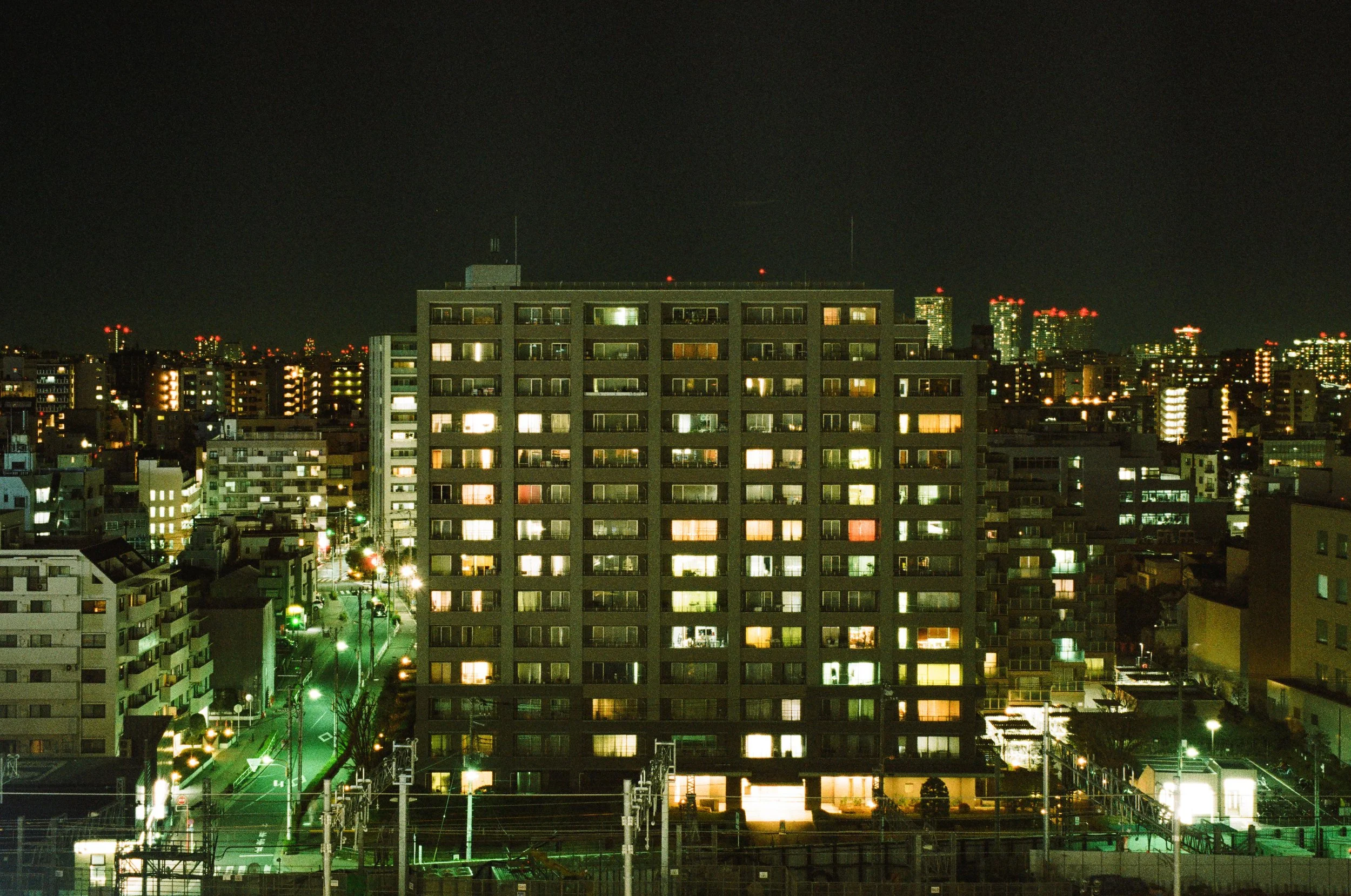 An unserem letzten Tag in Tokio wechselten wir nochmal in ein günstigeres Hotel, nur wenige Straßen entfernt und hatten uns nochmal einiges an Programm vorgenommen. So ließen wir uns u.a. auf Wunsch meiner Frau in traditionellen japanischen Gewändern ablichten und besuchten den nahegelegenen Asakusa-Schrein, den ältesten Tempel Tokios. Nachdem ich am Vortag recht wenig fotografiert hatte, wollte ich an unserem letzten Tag vor Ort nochmal die Gelegenheit nutzen, möglichst viele Impressionen auf Film festzuhalten. Und dahingehend kam ich dann am Abend auf der Dachterrasse unseres Hotels und beim anschließenden, nächtlichen Streifzug durch die nähere Umgebung durchaus auf meine Kosten.
